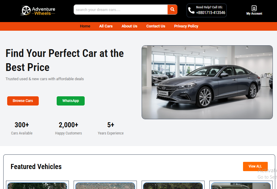 Modern car import and dealership website with vehicle listing system, detailed specs layout, and WhatsApp-based lead conversion.